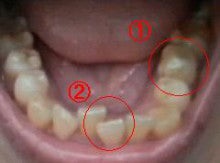 乳歯(上部写真の②)が永久歯より大きいため、他の歯が前に詰まってしまった。